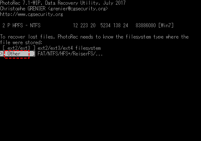 ステップ 4:パーティション全体をスキャンする「Whole」を選択します。ファイルの保存先フォルダを選択します。ここで、復元対象のHDDとは別のドライブにあるフォルダを指定し、キーボードのCキーを押して確定します。するとスキャンが開始されます。