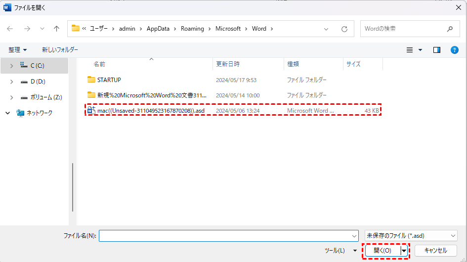 ステップ 4:リストを参照し、利用可能な自動保存された.asdファイル(Microsoft Wordが予期しないシャットダウンに備えて作業内容を一時的に保存するために自動生成する自動回復ファイル)を開きます。