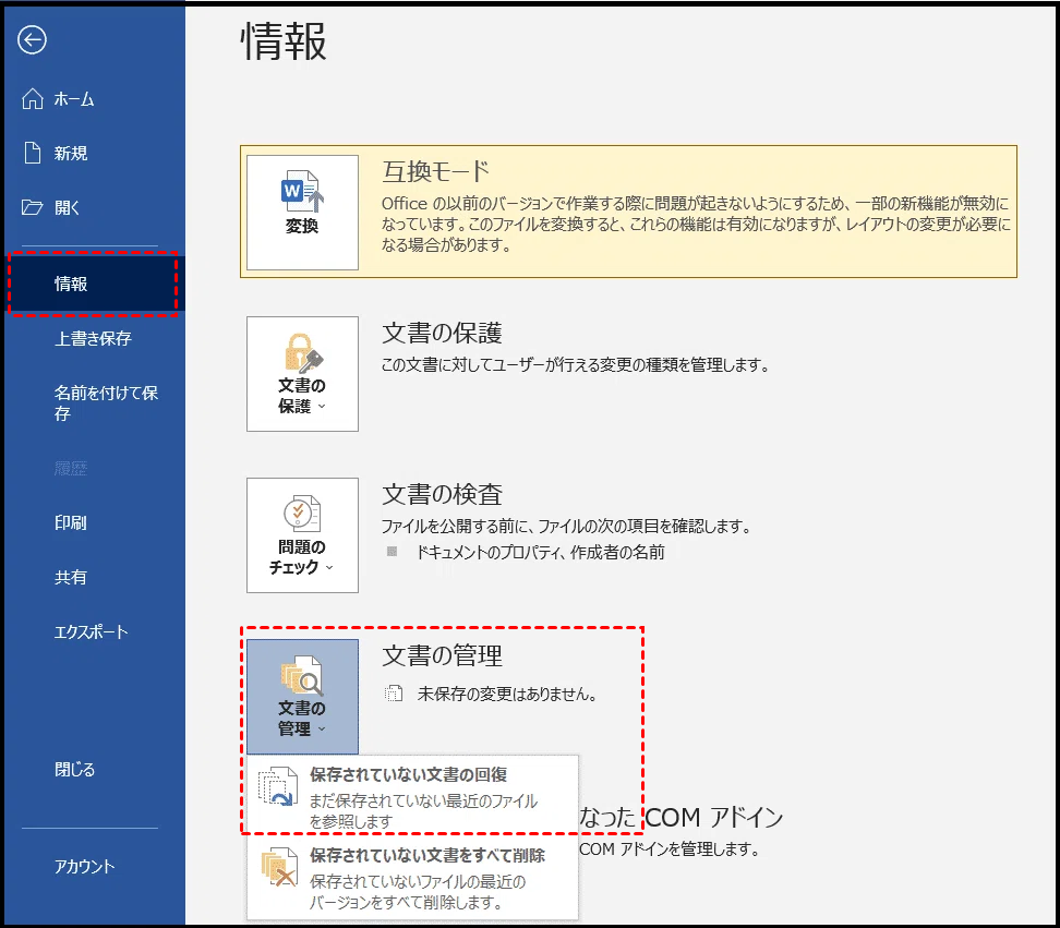 ステップ 2:「ファイル」>「情報」>「文書の管理」(Word)または「ブックの管理」(Excel)に進みます。