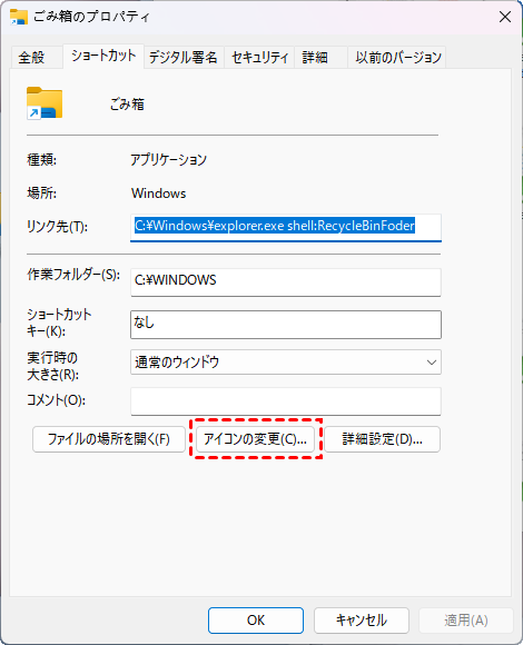 ステップ 4. 新しいごみ箱アイコンを右クリックし、「プロパティ」と「アイコンの変更」を選択します。