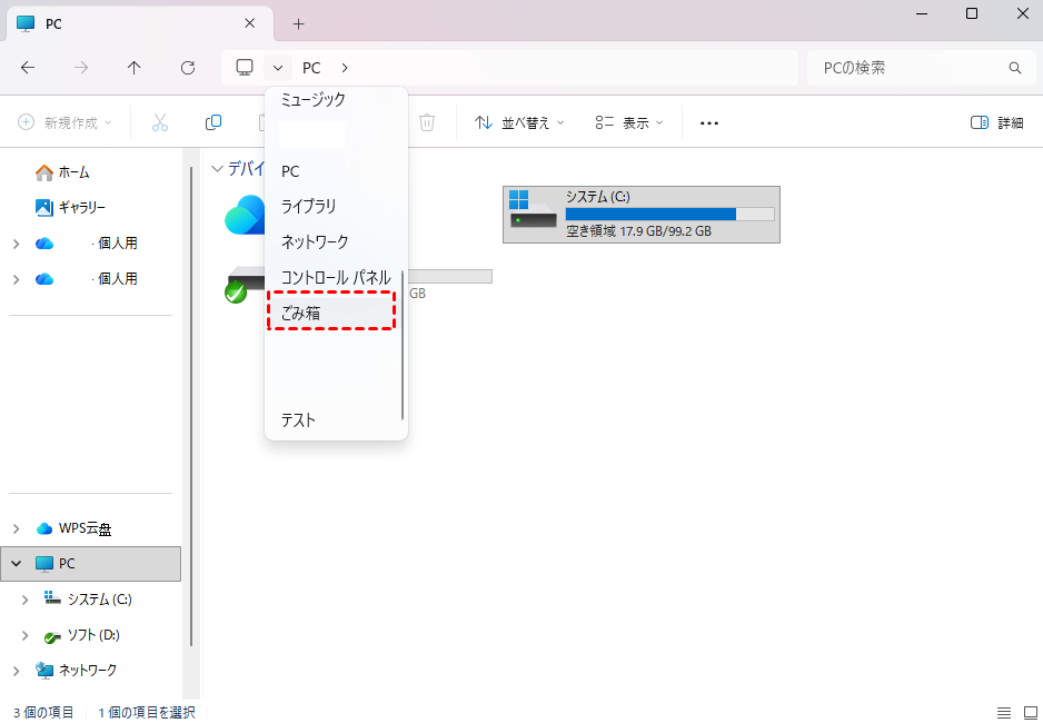 エクスプローラーでも簡単にごみ箱にアクセスできます。「PC」アイコンの横にある展開ボタンをクリックし、「ごみ箱」を選択して開くことができます。