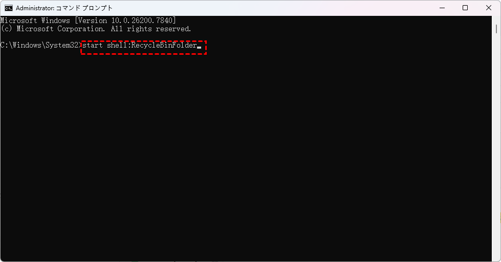 検索ボックスに「コマンドプロンプト」と入力して開きます。次に、以下のコマンド「start shell:RecycleBinFolder」を入力し、「Enter」キーを押すとごみ箱にアクセスできます。