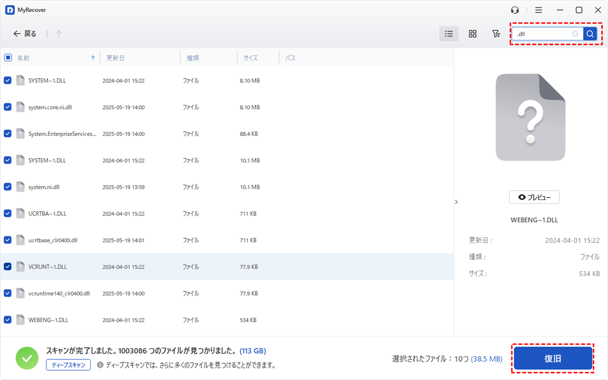 DLLファイルが削除され、バックアップもなく、上記の方法が全く機能しない場合は、MyRecoverのような専門的なデータ復元ソフトウェアに頼る時です。これはディスクをスキャンし、すべての見つからないDLLファイルを効率的に見つけて復元するのに役立ちます。