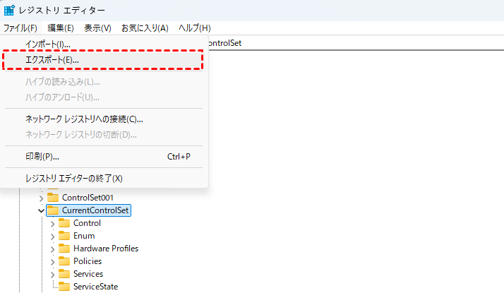 ステップ 1:「Win+R」キーを押し、「regedit」と入力して「Enter」キーを押し、レジストリエディターを開きます。「ファイル」>「エクスポート」をクリックして、レジストリの完全なバックアップを安全な場所に保存します。