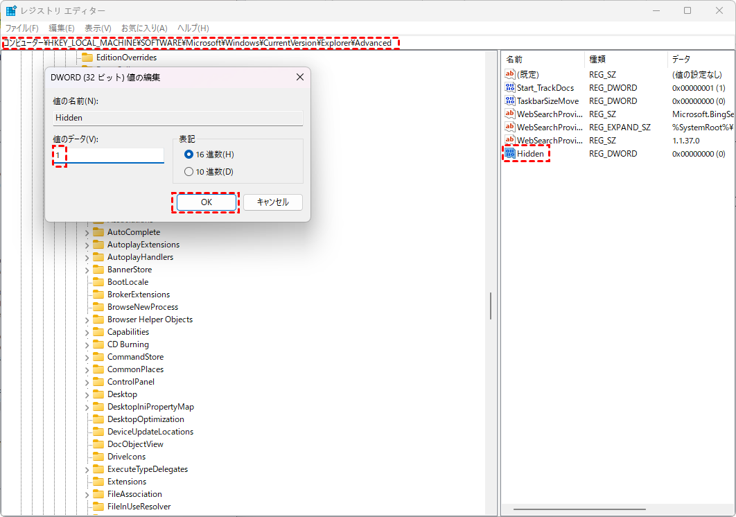 ステップ 3:「Hidden」をダブルクリックし、値データを「2」から「1」に変更します(ファイルやフォルダーを表示するため)。次に「OK」をクリックして変更を保存します。