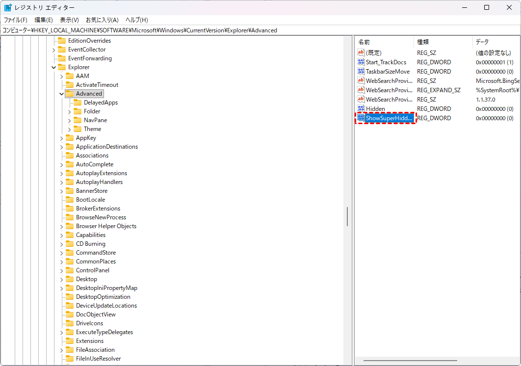 ステップ 4:(オプション):ファイルが保護されたオペレーティングシステムファイルである場合は、「ShowSuperHidden」を見つけ、ダブルクリックして値データを「1」に変更します。