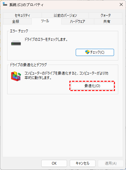 ファイルエクスプローラーを開き、縮小したいドライブを右クリックします。「プロパティ」を選択し、「ツール」タブに移動します。「最適化」をクリックします。