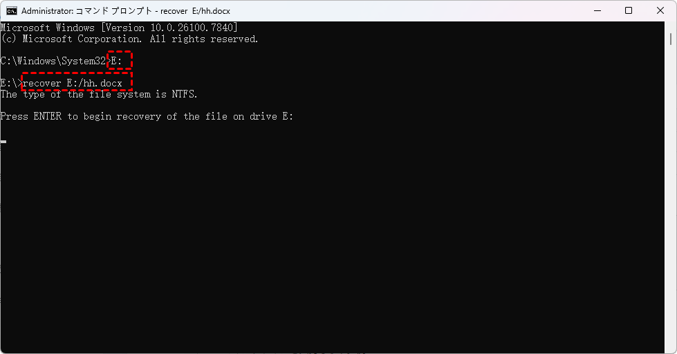 recover E:/hh.docx(正確なファイル名とファイルタイプを知っている必要があります)