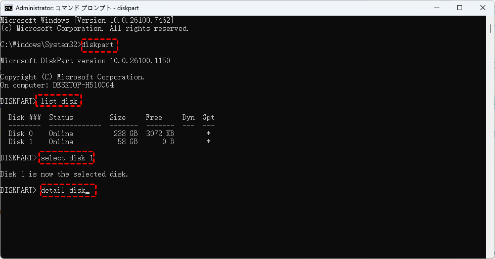 select disk X(Xをお使いのUSBメモリの番号に置き換えてください)
