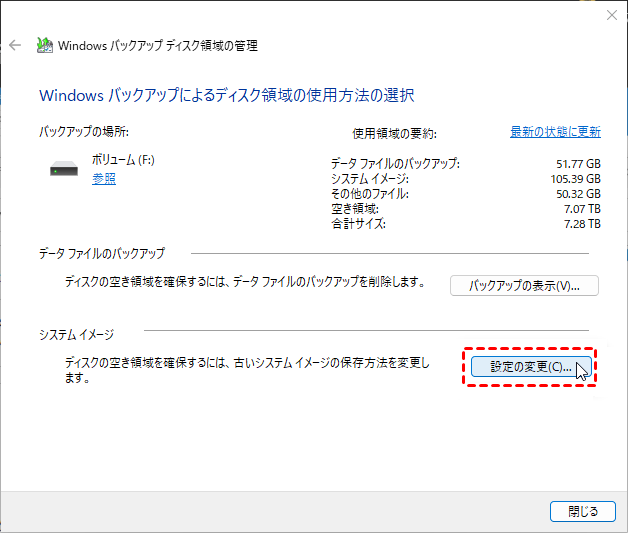 「Windowsバックアップディスク領域の管理」ウィンドウで、「システムイメージ」セクションの「設定の変更」をクリックします。