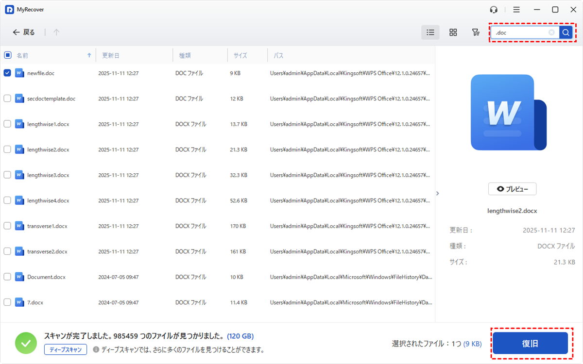 ステップ 3. 右上隅のフィルタ機能で「doc」または「docx」と入力して削除されたWordファイルをすべて検索し、復元したいファイルを選択して「復旧」をクリックします。