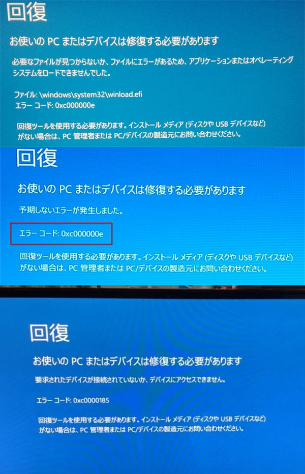 - 回復。お使いのPCまたはデバイスは修復する必要があります。必要なファイルが必要なファイルが見つからないか、ファイルにエラーがあるため、アプリケーションまたはオペレーティングシステムをロードできませんでした。ファイル:\windows\system32\winload.efi。エラーコード:0xc000000e。回復ツールを使用する必要があります。インストールメディア(ディスクやUSBデバイスなと)がない場合は、PC管理者またはPC/デイバスの製造元にお間い合わせください。
