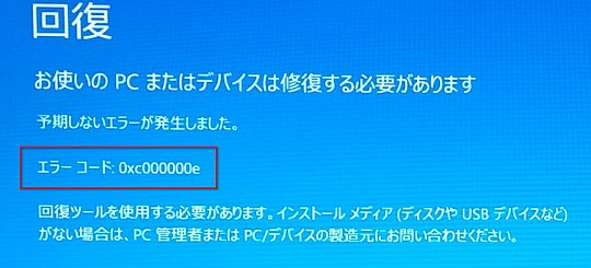 - 回復。お使いのPCまたはデバイスは修復する必要があります。予期しないエラーが発生しました。エラーコード:0xc000000e。回復ツールを使用する必要があります。インストールメディア(ディスクやUSBデバイスなと)がない場合は、PC管理者またはPC/デイバスの製造元にお間い合わせください。