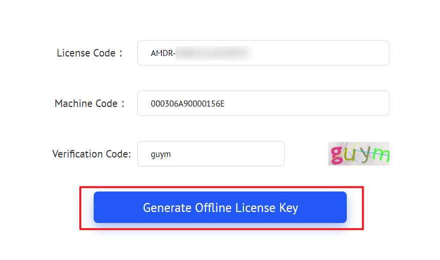 ステップ 2. 開いたウェブページにライセンスコード(License Code)とマシンコード(Machine Code)を貼り付け、「Get Offline License Key(オフラインライセンスキーの取得)」ボタンをクリックしてオフラインライセンスキーを取得します。