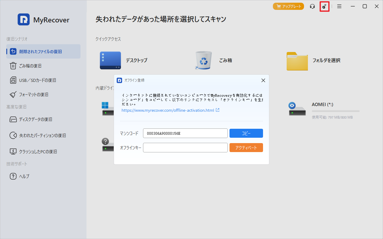 ステップ 1. インターネットに接続していない状態でMyRecoverを実行し、「キー」アイコンをクリックします。オフライン登録ウィンドウが表示されます。次に、インターネットに接続し、オフライン登録ウィンドウのURL(https://www.myrecover.com/offline-activation.html)を開きます(または、インターネットに接続されている別のコンピュータでURLを開くこともできます)。