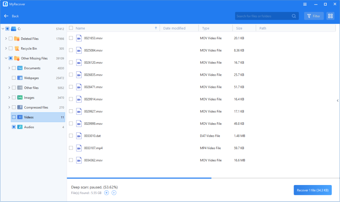 The app automatically scan all missing files; you can manually select the type, modified time, and size of the files that you want to retrieve via Filter function.