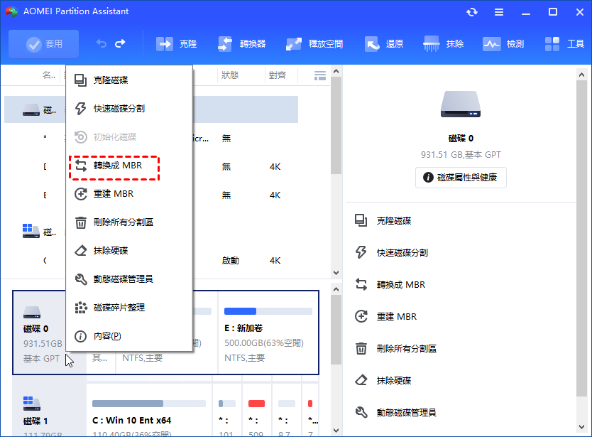雖然在 Windows 內建的磁碟管理中遇到 GPT 保護性分割區時,你可能無法進行任何操作,但一些第三方分割區管理器可以提供協助,例如 AOMEI Partition Assistant。這個免費工具可以將磁碟轉換為 GPT 或 MBR,而無需刪除目標磁碟上的分割區。僅需 3 個步驟即可將 GPT 磁碟轉換為 MBR。
