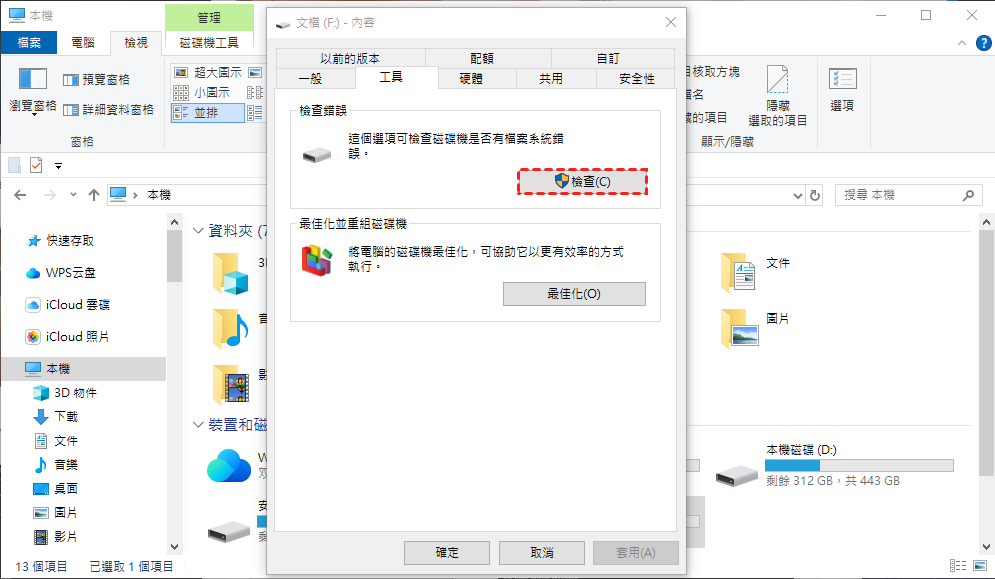 步驟 3. 前往「工具」標籤頁,在「錯誤檢查」區段中點擊「檢查」,然後點擊「掃描磁碟機」以開始程式。它將掃描磁碟機並修復磁碟錯誤。