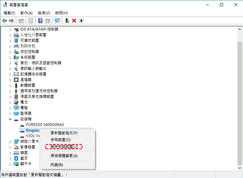 步驟 2. 展開「磁碟機」,並選取未格式化的 USB 隨身碟。在其上點擊右鍵並選擇「解除安裝裝置」。