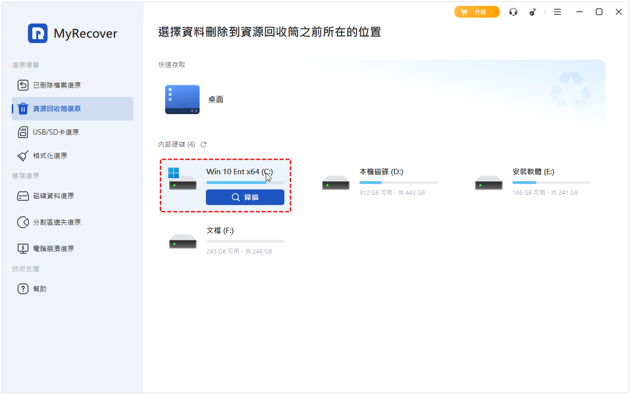 步驟 2. 開啟 MyRecover,然後選擇遺失檔案所在的磁碟機,通常會是「C:」 (如果檔案原本在你的桌面或使用者資料夾)。點擊「掃描」。