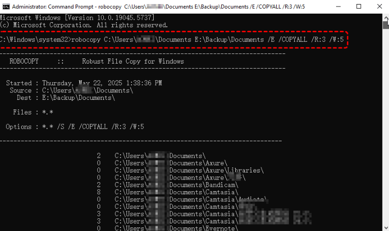 範例:robocopy C:\Users\YourUserName\Documents E:\Backup\Documents /E /COPYALL /R:3 /W:5