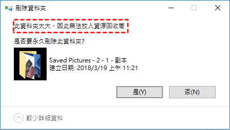 當你刪除的檔案或資料夾大小超過資源回收筒的容量限制時,Windows 將無法將其移至資源回收筒。此時檔案會立即被永久刪除。