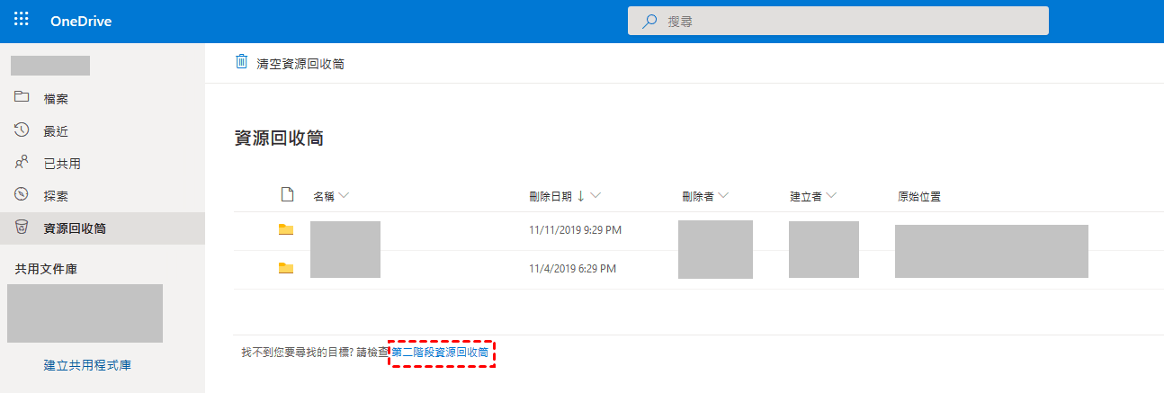 除了資源回收筒外,OneDrive 還提供「第二階段資源回收筒」,用於保留從 OneDrive 永久刪除的檔案——例如使用「Shift+Delete」刪除、清空資源回收筒或超過保留期限的檔案。