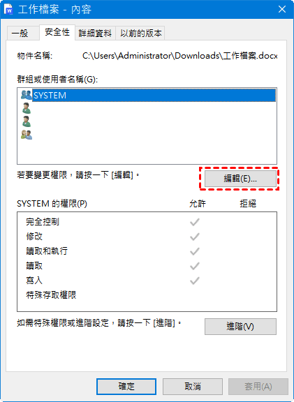 步驟 2. 選中「內容」,然後切換到「安全性」,點擊「編輯」。