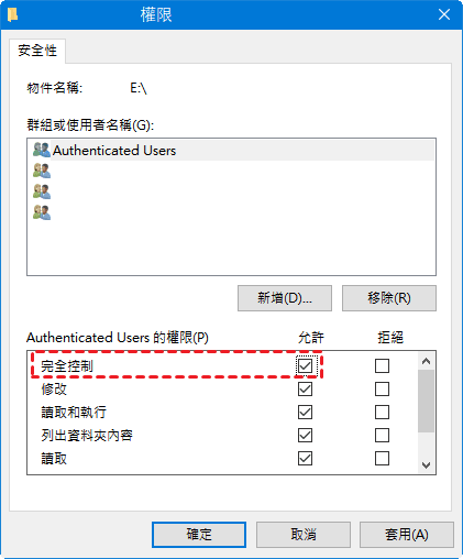 步驟 3. 選中您的賬戶,在賬戶權限中勾選「完全控制」權限,點擊「套用」。