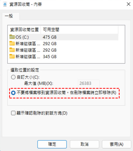 2. 選擇「不要將檔案移至資源回收筒。刪除檔案時立即移除檔案。」