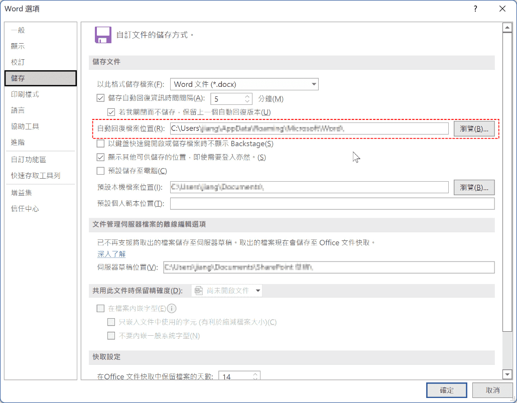 步驟 2. 在「儲存」中找到「自動回復檔案位置」,並複製後面的路徑。