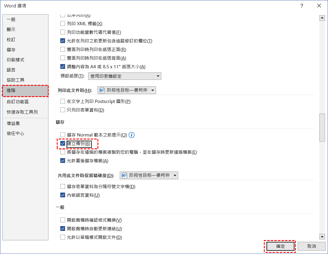 永遠建立備份副本:可手動開啟。啟用後,每次儲存檔案時,Word 會先將當前的舊版本複製一份並為其命名為「備份 某某某.wbk」,然後才儲存新版本。這樣一來,你永遠有一個「上一版」的備份可以回溯。