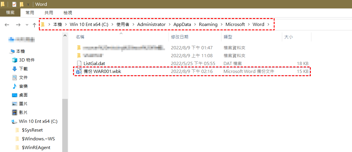 依照上面的步驟進入暫存檔資料夾,找到檔案名為「.wbk」的檔案,開啟檔案檢視內容是否正確。如果內容正確,請將檔案名改為「.docx」。