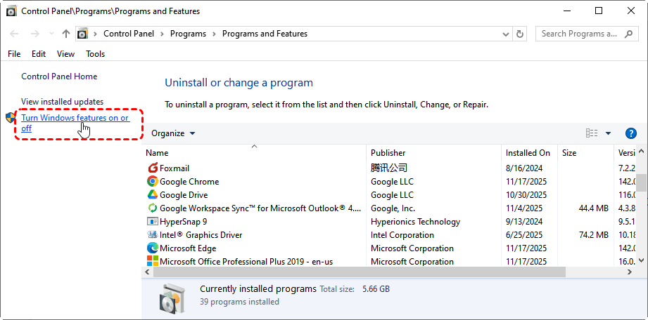 Step 2. Click "Turn Windows features on or off" on the left panel.