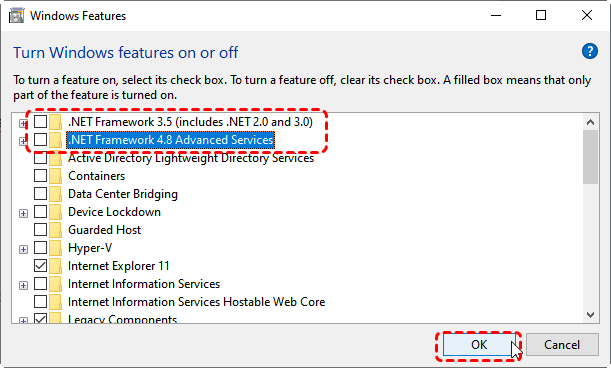 Step 3. Locate ".NET Framework 3.5 and .NET Framework 4.x", uncheck them, and click "OK".