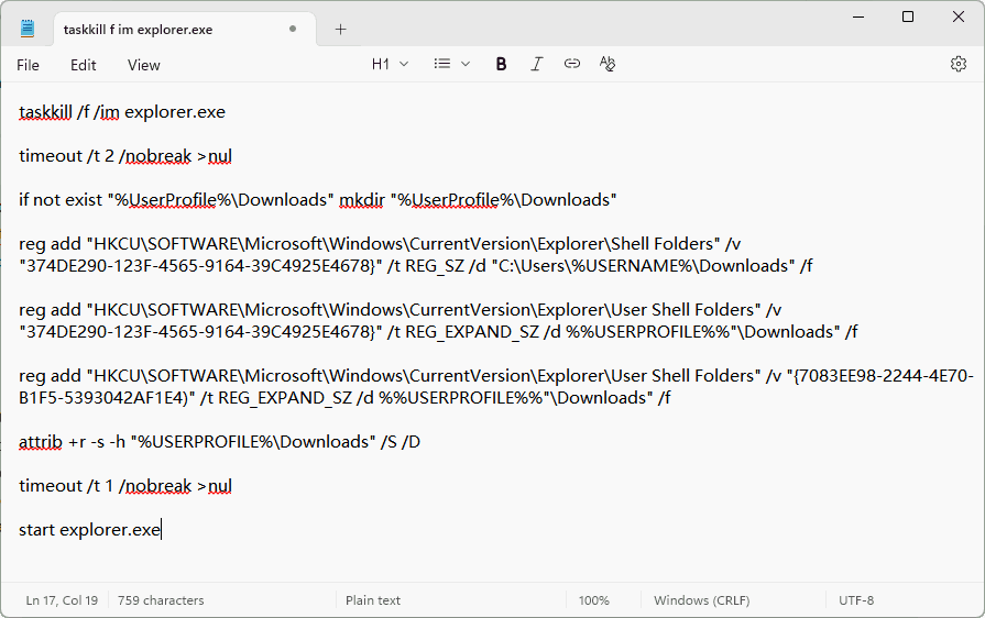 Besides, you can also recover the Downloads folder by creating a batch file. Here it is: