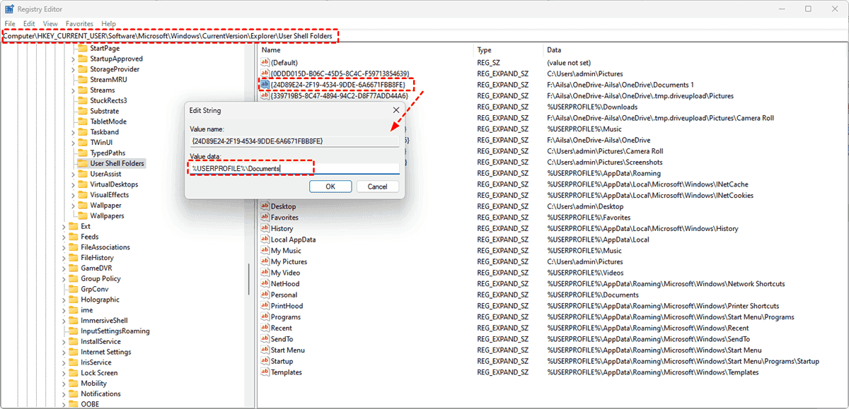 4. Find the name and data of the Documents folder, change your customized value to %USERPROFILE%\Documents, and hit OK.