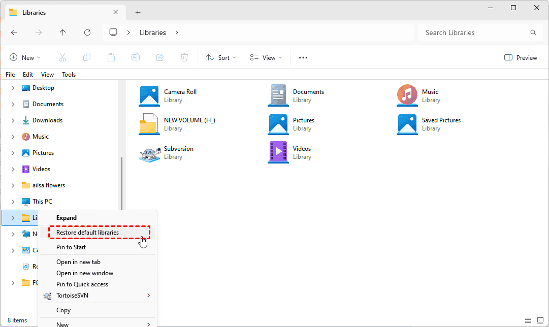 Open File Explorer, click on Libraries on the left pane to open the folder. Right-click the Libraries item on the left and select Restore default libraries.