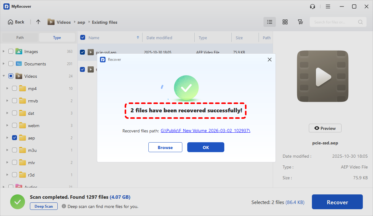 When the file is permanently deleted, missing from backups, or the drive shows errors, professional data recovery tool like MyRecover becomes necessary. Its two modes, Quick Scan and Deep Scan, can quickly find your desired files without missing any important data, making it an ideal recovery tool when files bypass the Recycle Bin or storage corruption occurs. It also supports the recovery of over 1,000 file types, including photos, videos, audio, compressed files, design files, and more.