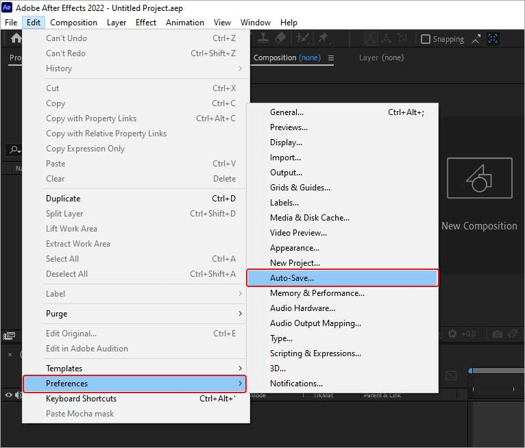 Step 1. Launch After Effects and go to "Edit" > "Preference" > "Auto-Save".