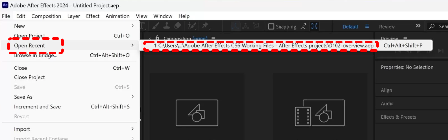 Step 1. Launch Adobe After Effects and go to "File" > "Open Recent".