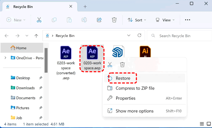 If the After Effects projects file was deleted recently (not "Shift" + "Delete"), it may still be stored in the Recycle Bin. This is the fastest and safest recovery option because it restores the original file without scanning the disk. You can restore your files from Recycle Bin to their original location.