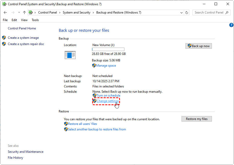 Review Backup Location: click "Change settings": Ensure the backup is pointing to a valid drive with enough space. Avoid network drives with unstable connections.
