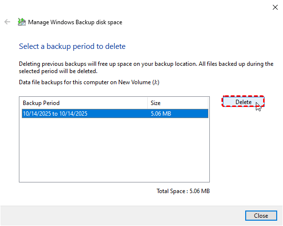 Delete Corrupted Backups: If a backup is incomplete or damaged, select it and choose "Delete" to remove the corrupted file.