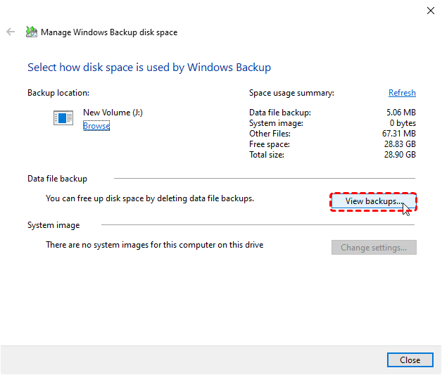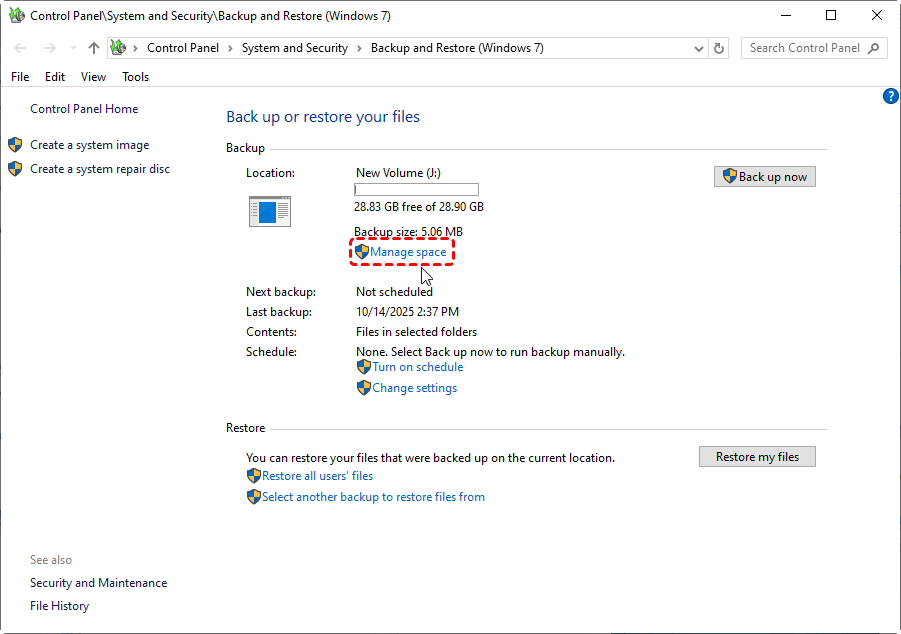 Locate Existing Backup Files: Check where your previous backups are stored, usually in Control Panel → System and Security → Backup and Restore (Windows 7) → Manage space → View backups.