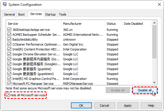 Run Windows in Clean Boot Mode: This helps identify conflicts by starting Windows with minimal services and startup programs: Type "msconfig"in the search box → open "System Configuration"→ under "Services", check "Hide all Microsoft services"→ click "Disable all"→ restart your PC.