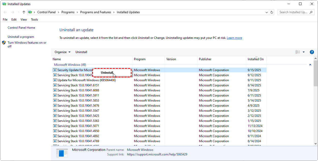 From the list, select update you want to remove, and then select "Uninstall".