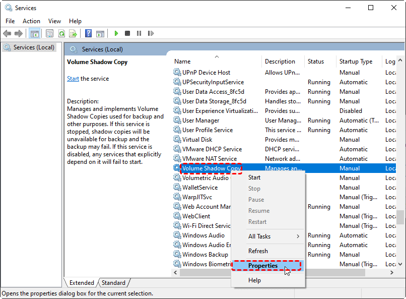 Step 2. Locate Volume Shadow Copy in the list. Right-click it and select "Properties".