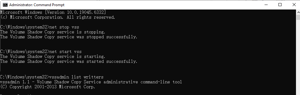 Check if the writers show No error. If errors persist, you may need to re-register VSS DLL files: