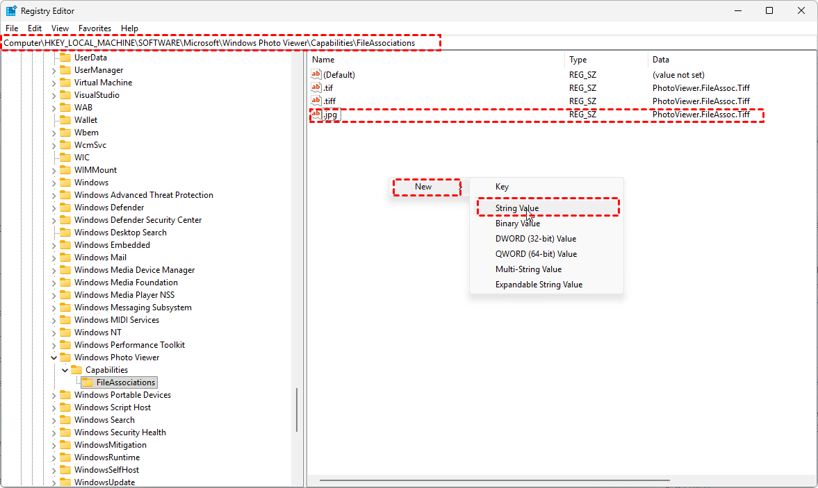 5. To reactivate Windows Photo Viewer, navigate to HKEY_LOCAL_MACHINE\SOFTWARE\Microsoft\Windows Photo Viewer\Capabilities\FileAssociations, in the right pane, right-click and select New > String Value.